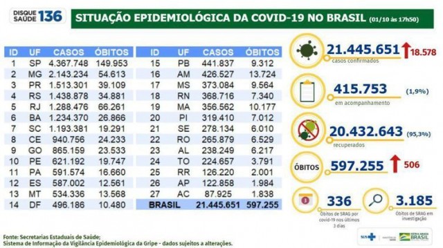Com os novos diagnósticos de covid-19 confirmados, o total de pessoas contaminadas desde o início da pandemia chegou a 21.445.651.