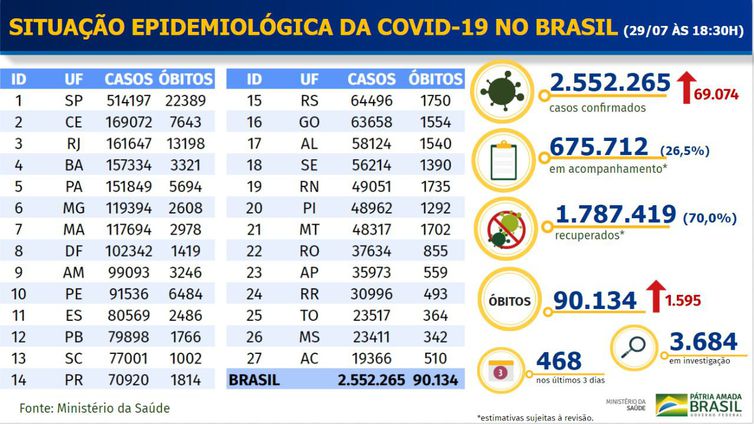 A soma das pessoas infectadas desde o início da contagem atingiu 2.552.265. Nas últimas 24 horas, foram 69.074 novas notificações incorporadas no sistema do Ministério da Saúde. Ontem o total era de 2.483.191.