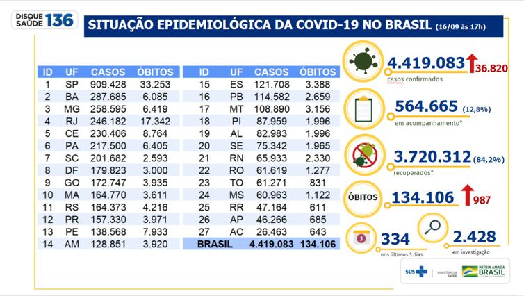 Os dados estão no balanço diário do Ministério da Saúde divulgado na noite desta quarta-feira (16).