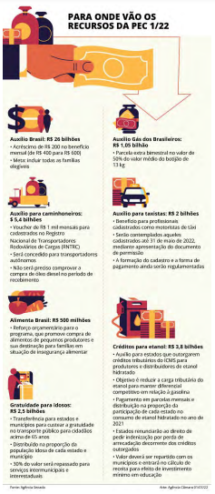 A PEC institui um estado de emergência, permitindo que o presidente Jair Bolsonaro (PL) fure o teto de gastos e abra os cofres públicos a três meses da votação para a Presidência sem esbarrar em restrições da lei eleitoral. Bolsonaro ocupa o segundo lugar nas pesquisas de intenção de voto, atrás do ex-presidente Luiz Inácio Lula da Silva (PT).