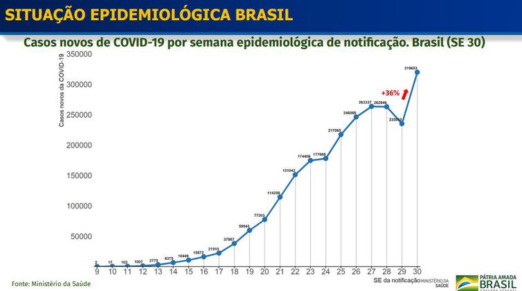 O movimento marca uma inversão da curva. De acordo com os dados da pasta, a média diária de casos confirmados estava relativamente estável ao longo do mês de julho. Na 28ª semana epidemiológica, a média diária bateu os 37.549, caindo para os 33.573 na semana seguinte (29ª), antes de voltar a subir.