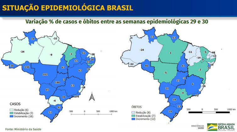 A evolução da pandemia difere em regiões e estados. O boletim epidemiológico aponta que entre as semanas epidemiológicas 29 e 30 houve aumento de casos em 18 estados e de óbitos em 12. O cenário de estabilidade ocorreu, respectivamente, em 3 e 7 estados. Já a redução foi identificada em 6 Unidades da Federal (no quesito casos confirmados) e 8 (no quesito óbitos).