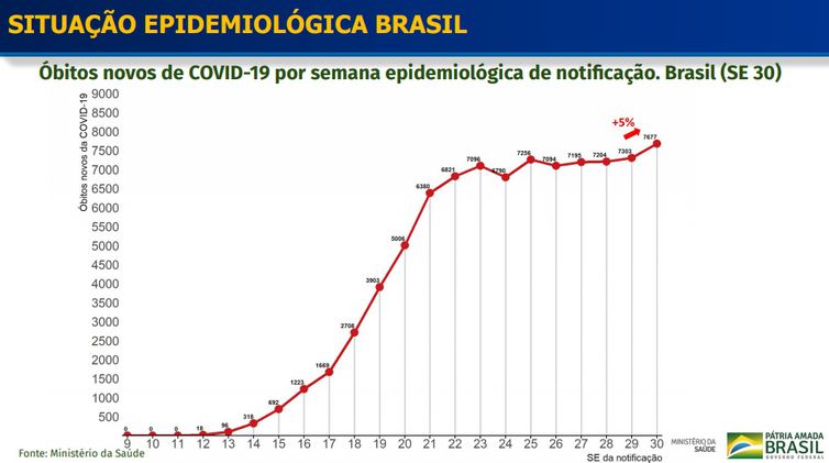 “A curva de óbito tem se mantido constante desde a 22ª SE. Quando comparamos a 29ª com a 30ª, tivemos um aumento de 300 casos. A gente verifica que desde o dia 20 de julho a gente teve aumento de casos registrados quando comparamos a 28ª da 29ª, quando houve queda, com a 29ª para a 30ª, quando houve aumento”, afirmou o secretário de Vigilância em Saúde do Ministério da Saúde, Arnaldo de Medeiros, em entrevista coletiva na sede do órgão.