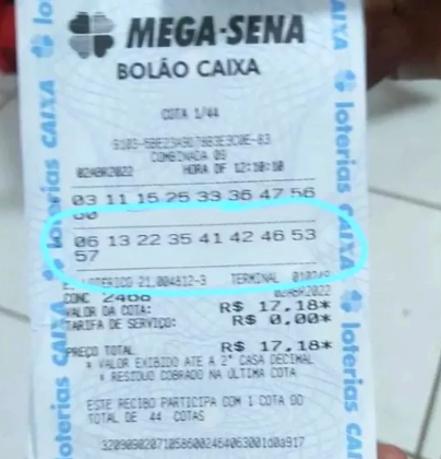 A aposta foi realizada com nove números. Cada vencedor gastou R$ 17,18 para participar de dois jogos com nove números cada. Os números sorteados foram: 22 – 35 – 41 – 42 – 53 – 57.