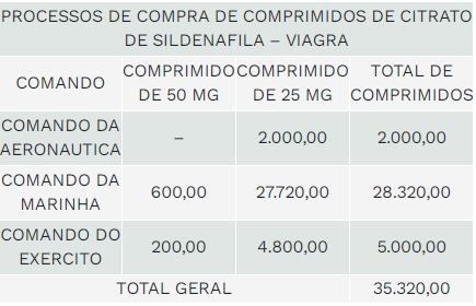 Os dados são do portal da Transparência e do painel de preços do governo. Nos processos, de licitação o medicamento aparece com o nome genérico Sildenafila, nas dosagens de 25 mg e 50 mg. A maior parte dos medicamentos é destinado à Marinha, com 28.320 comprimidos; mas o Exército (5 mil comprimidos) e a Aeronáutica (2 mil comprimidos) também são atendidos.