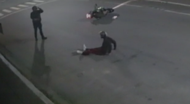 Um circuito de segurança registrou o momento em que a vítima foi abordada pelos homens e entregou a motocicleta.