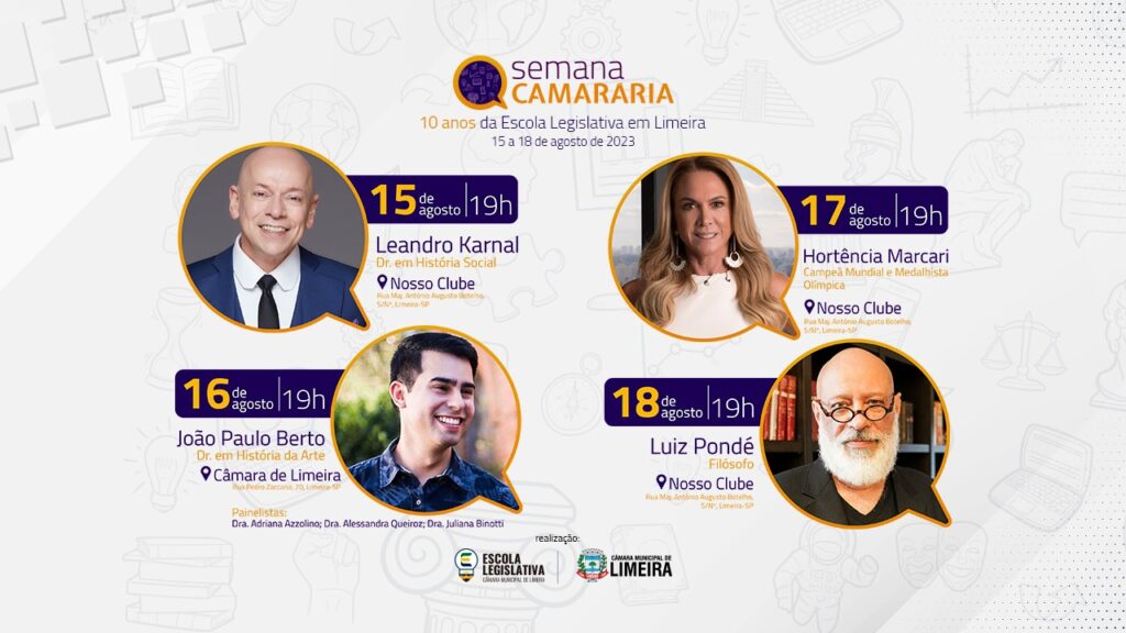 O evento que será realizado dos dias 15 à 18 de agosto contará com quatro palestras, cada uma com temas diferentes. Professor Leandro Karnal conduzirá a primeira palestra sobre Antropologia, o professor João Paulo Berto apresentará sobre história geral e história de Limeira seguido de uma oportunidade de debate.