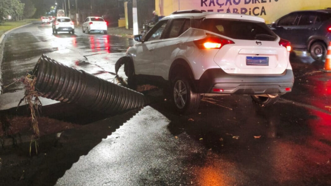 A cratera foi aberta pela Prefeitura de Americana na última segunda-feira (27) para reparos em uma galeria pluvial. Durante o incidente, tubulações recém-instaladas chegaram a atingir o carro.