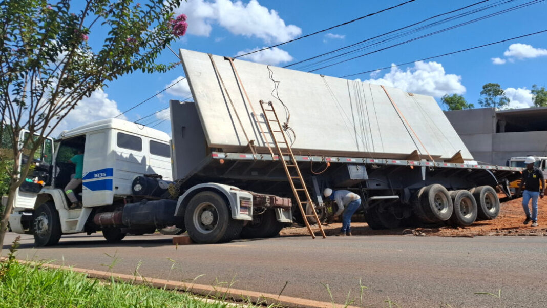 Um caminhão de cinco eixos carregado com placas pré-moldadas de concreto tombou parcialmente e interditou a Avenida Ampélio Gazzetta, em Nova Odessa, no início da tarde de segunda-feira (26). O veículo ficou atravessado na pista durante uma manobra, provocando bloqueio temporário do tráfego no local.