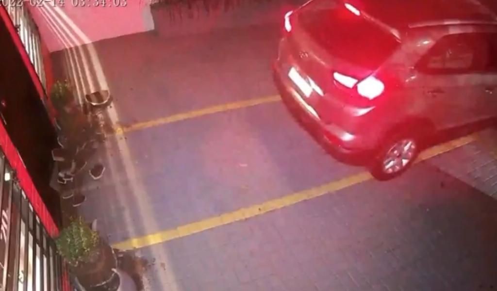 Pelas imagens, três ladrões estão no veículo que, de marca à ré, destrói a porta do comércio. Os criminosos invadem o estabelecimento, furtam produtos e colocam no carro.