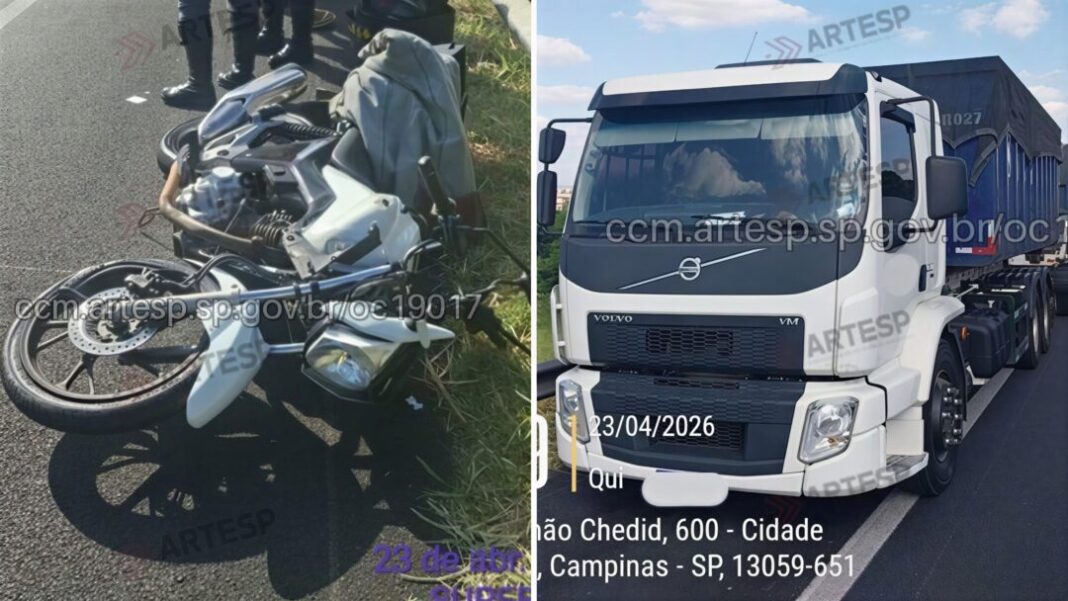Com o impacto, a motocicleta permaneceu no acostamento, enquanto a carreta parou parcialmente entre a faixa quatro e o acostamento.