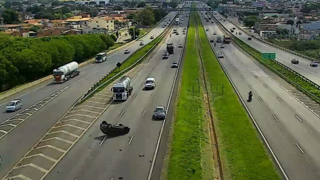 Imagens de câmeras da concessionária Rota das Bandeiras, que administra a via, mostram que o carro seguia pela marginal e, ao tentar acessar a pista principal, foi atingido na traseira por outro veículo, provocando o capotamento.