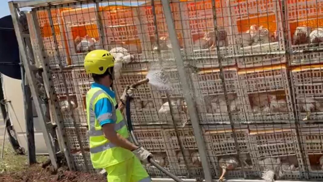 A carga, vinda de uma granja na região de Charqueada, ficou parcialmente dentro do veículo, mas o impacto e o forte calor do sol resultaram na morte de centenas de aves.