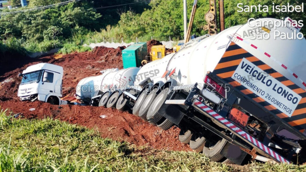 A carreta ainda permanece no local, e a retirada depende de um guindaste especializado enviado pela concessionária Rota das Bandeiras. Por segurança, o acostamento no sentido sul segue interditado.