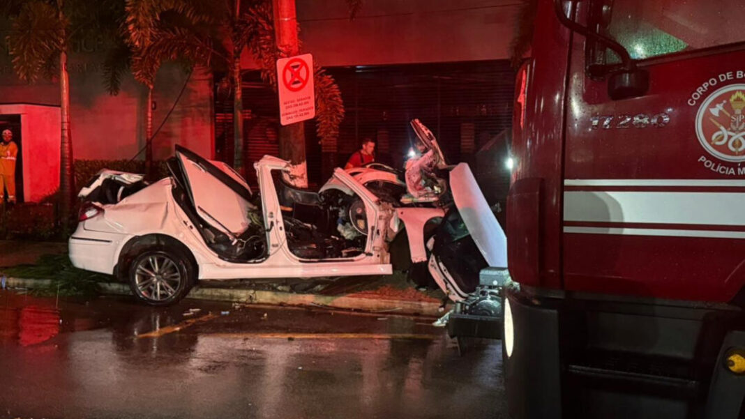 Os bombeiros precisaram serrar o teto do automóvel e remover as portas, possibilitando o acesso seguro às vítimas.