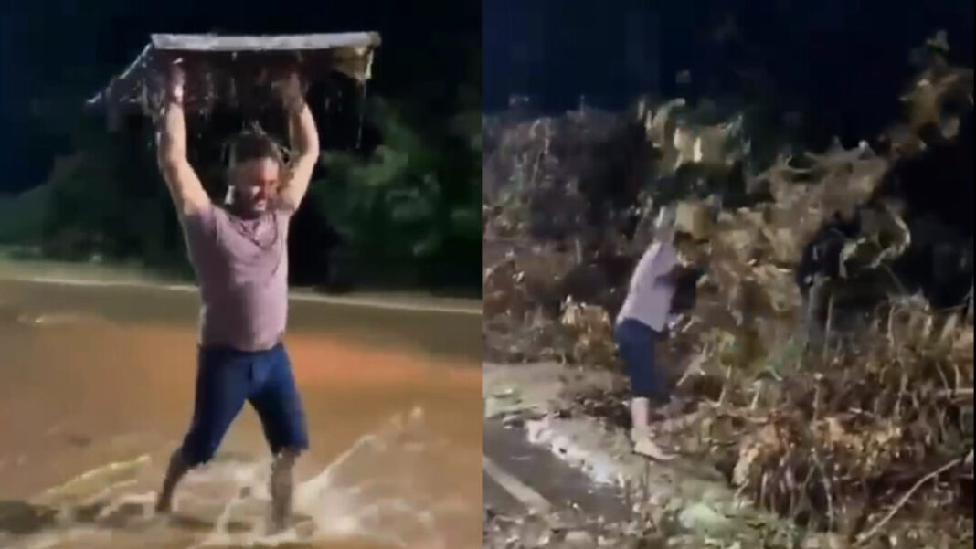 Nos registros, o diretor aparece retirando resíduos acumulados em bueiros para facilitar o escoamento da água e contribuir para a liberação da via, que apresentava dificuldades para a passagem de veículos após as chuvas. Em outra sequência, ele remove a grade metálica de uma galeria de águas pluviais e recolhe galhos caídos sobre a pista, que estariam represando a água e intensificando o alagamento.