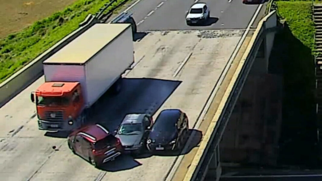 Imagens do sistema de monitoramento da rodovia mostram o momento em que um carro, ao mudar da quarta para a terceira faixa, entrou à frente de um caminhão e foi atingido na traseira. O impacto fez o veículo rodar na pista e ser atingido por outros dois carros antes de tombar.