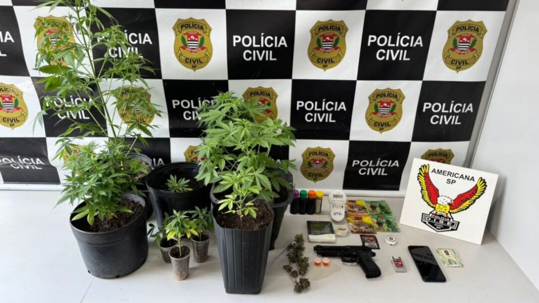 No local, os agentes apreenderam nove pés de maconha cultivados em vasos dentro da estufa, 20 porções já embaladas para a venda, sete envelopes com sementes da droga, além de um simulacro de pistola, um celular e utensílios utilizados no cultivo, como frascos com líquidos, timer e termômetro digital.