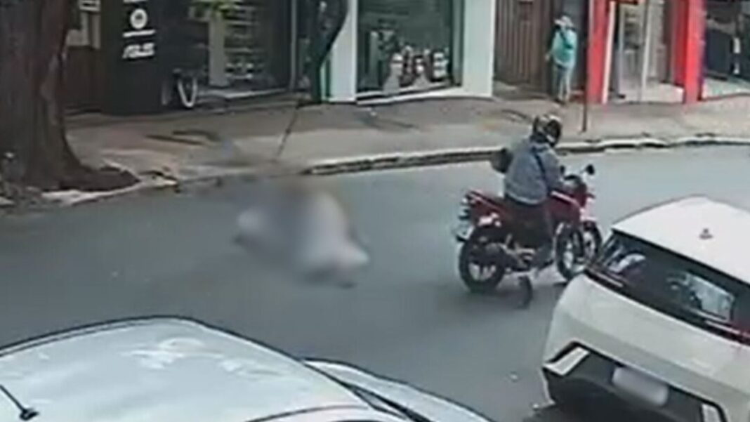 Uma mulher foi atropelada por uma motocicleta no início da tarde desta quarta-feira (4), na Rua Washington Luís, no Centro de Americana. O acidente foi registrado por câmeras de segurança de um estabelecimento comercial.