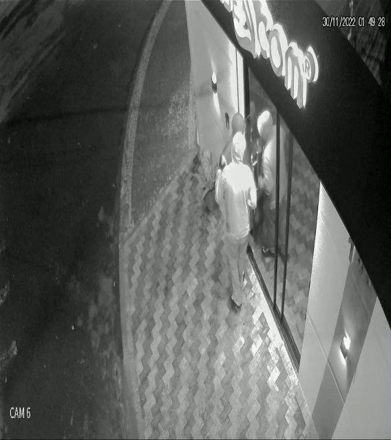 Através das imagens das câmaras de segurança, por volta da 01h30, um Ford Fiesta vermelho se aproxima da agência e descem do veículo três homens encapuzados. Com uma ferramenta, eles quebram a porta de vidro e o alarme de segurança é ativado.