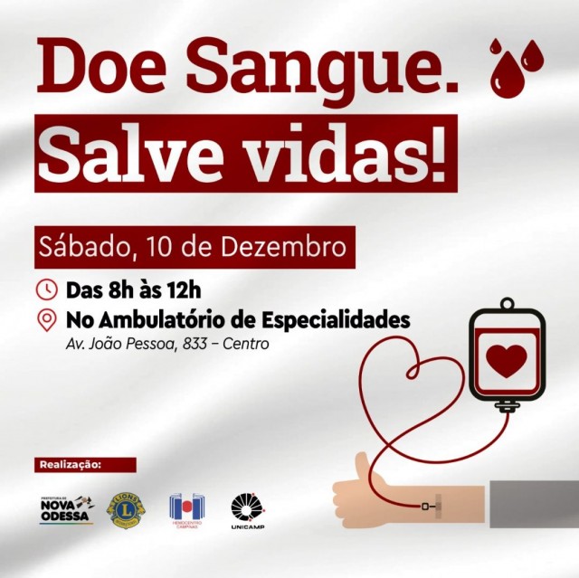 “Deixamos o convite à população de Nova Odessa para que compareça e colabore com essa causa tão nobre, porque tem muitas pessoas carecendo de sangue, e toda doação é bem-vinda e pode ajudar a salvar vidas”, comentou o prefeito Cláudio José Schooder, o Leitinho.