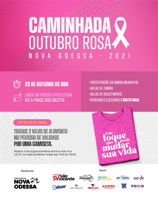 A Prefeitura de Nova Odessa inicia na próxima terça-feira (19) a troca de dois quilos de alimentos não perecíveis por uma camiseta personalizada da Caminhada do “Outubro Rosa”, que será promovida pela administração, com apoio de várias empresas, no sábado (23) – como parte das atividades do mês de combate ao câncer de mama.