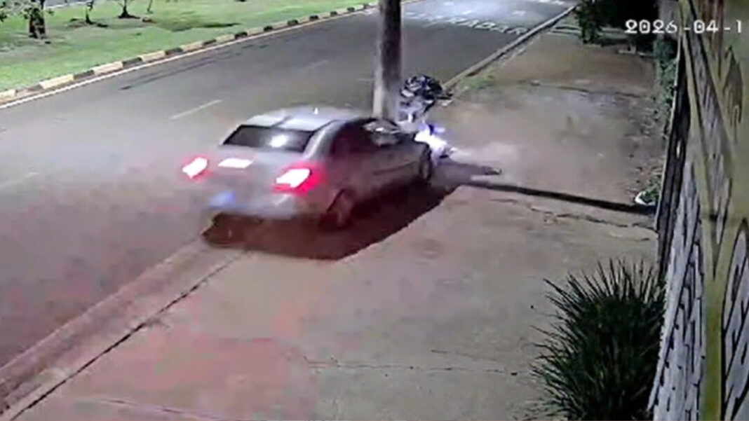 Por volta das 5h, o motorista de um veículo perdeu o controle da direção e acabou atingindo um poste. Câmeras de segurança instaladas nas imediações flagraram o momento exato da batida.