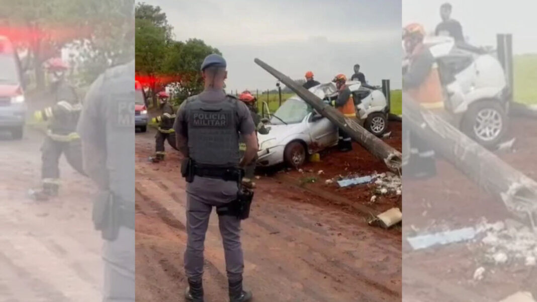 O veículo seguia pela via quando capotou e atingiu o poste, que caiu sobre o carro. Com a estrutura danificada e a lataria amassada, o motorista não conseguiu sair.