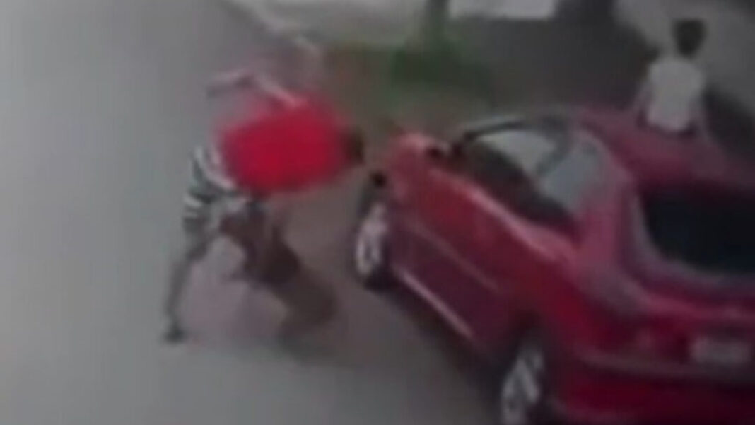 Nas imagens, é possível notar que o o homem chega a erguer o filho e colocá-lo sobre um carro estacionado para protegê-lo, mas o pitbull continua investindo e também o atinge. O pai, ferido, sobe no veículo para escapar das mordidas.