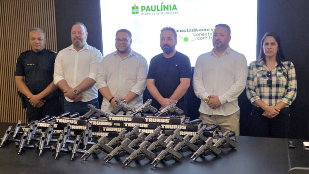 O prefeito de Paulínia, Danilo Barros (PL), entregou pessoalmente ao colega de Sumaré, Henrique Stein Sciáscio (Republicanos), a doação de 50 pistolas calibre 380 da marca Taurus para a Polícia Municipal sumareense.