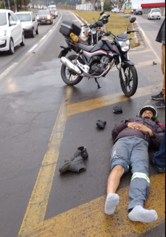 O motociclista acabou arremessado por cerca de 40 metros e sofreu ferimentos na perna. Ele foi socorrido pelo profissional que estava no local até a chegada de uma equipe do Serviço de Atendimento Móvel de Urgência (SAMU). O rapaz foi encaminhado para a Unidade de Pronto Atendimento (UPA) Macarenko.