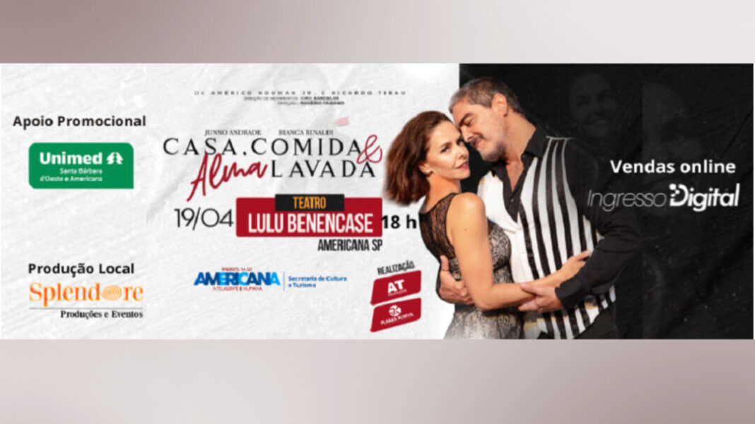 A peça teatral “Casa, Comida e Alma Lavada” será apresentada no domingo (19), às 18h, no Teatro Municipal Lulu Benencase, em Americana. O espetáculo traz ao público uma comédia que retrata o relacionamento do casal Tânia Mara e Luís Alberto ao longo de 20 anos de casamento.