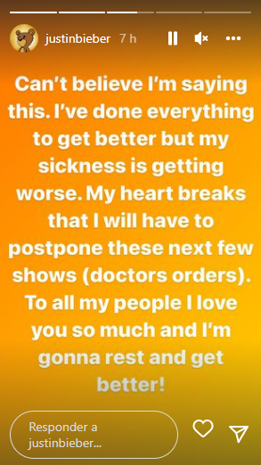 Justin Bieber anunciou que terá que adiar alguns shows da “Justice World Tour” por motivos de saúde. Sem detalhar o quadro clínico nem quais apresentações serão postergadas, o cantor deu a notícia via Instagram Stories.