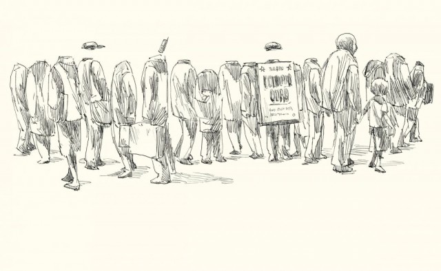 Nos desenhos, eles surgem com corpos transparentes. A gente só sabe que estão ali por causa das roupas. Só elas podem ser vistas e mostram que essas pessoas estão lá. As páginas, então, surgem recheadas de casacos sem cabeças, blusas sem braços, bonés flutuantes, bermudas sem pernas.