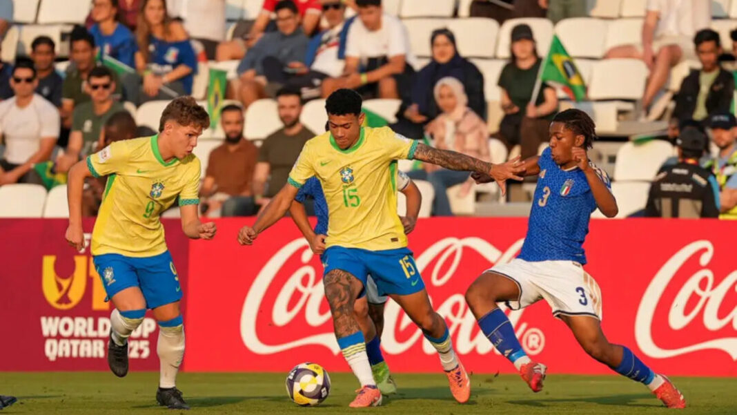 A seleção brasileira masculina Sub-17 terminou o Campeonato Mundial Sub-17, em Doha (Catar), na quarta colocação após ser superada pela Itália por 4 a 2 nas cobranças de pênaltis. A disputa pela medalha de bronze ocorreu no complexo esportivo Aspire Zone. Mesmo com um jogador expulso aos 12 minutos, o Brasil sustentou o empate sem gols até o fim dos 90 minutos.