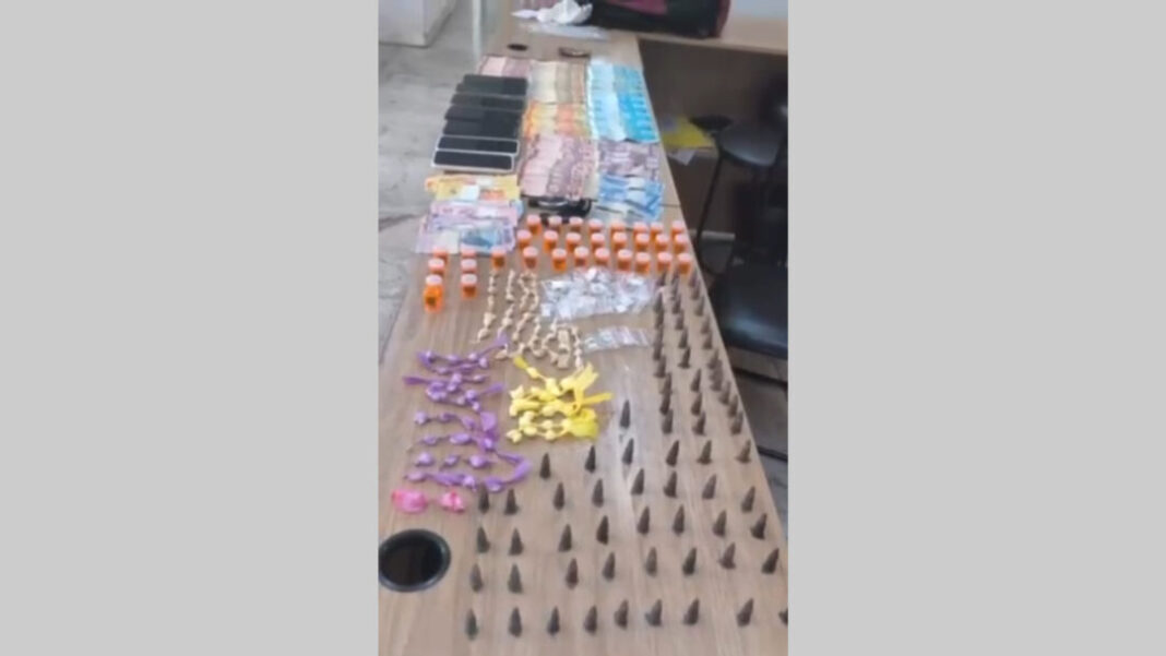 Na mochila abandonada foram encontrados 50 papelotes de cocaína, 69 pinos de cocaína, 32 porções de maconha, 51 papelotes de crack e 21 porções de “dry”. Outros indivíduos presentes no local também foram abordados. Com um deles, a polícia encontrou R$ 1.860 em dinheiro. Dentro da adega, foram localizados mais R$ 472 e oito aparelhos celulares.