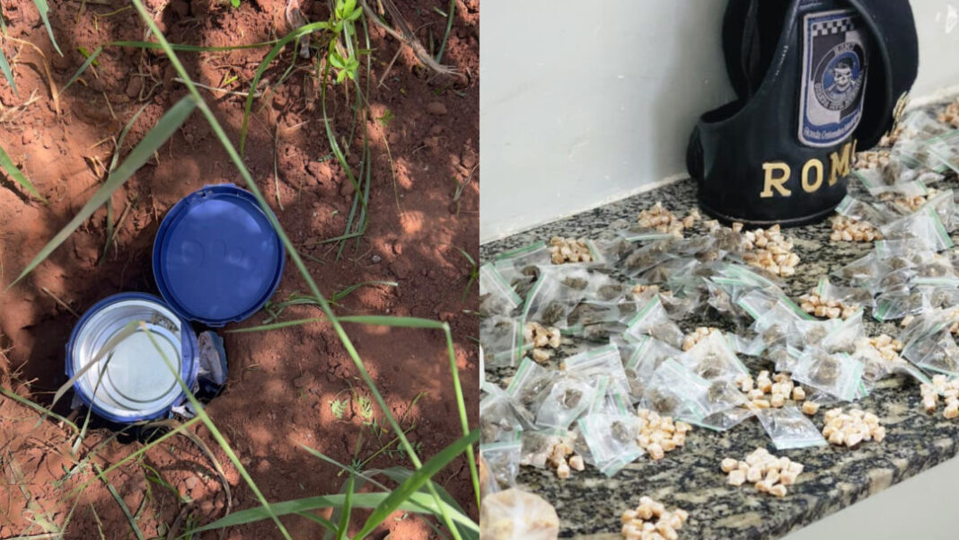 Com o auxílio do cão farejador Bono, os agentes realizaram uma varredura no terreno e localizaram entorpecentes enterrados em quatro pontos diferentes.
