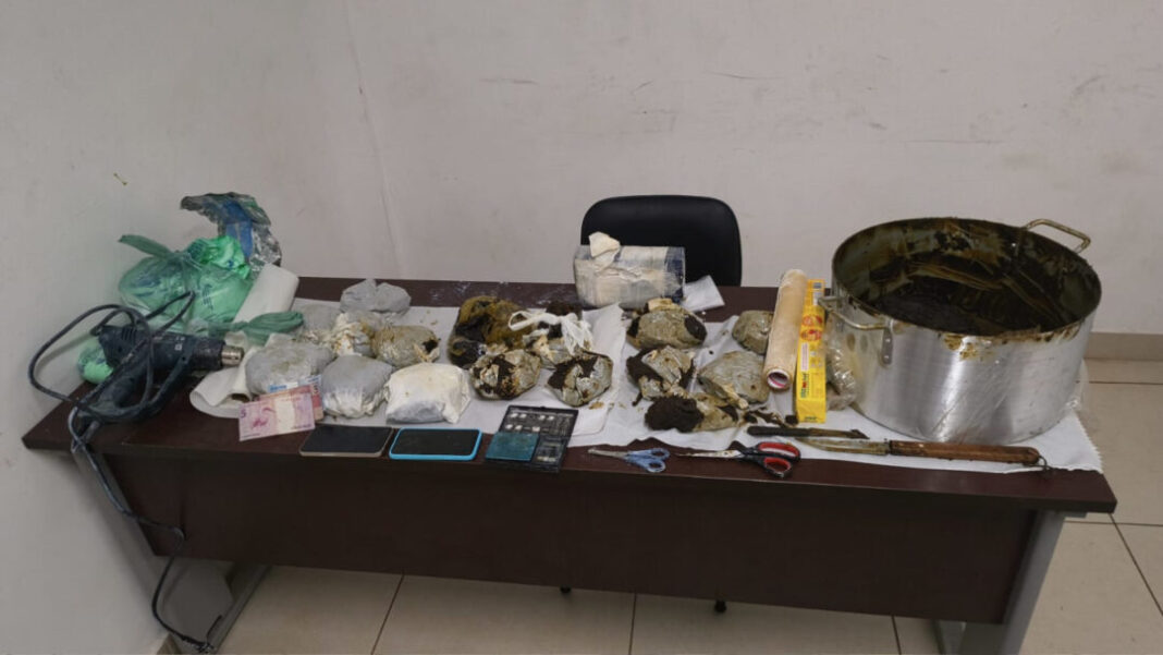 Ao todo, foram apreendidos 17 tabletes de maconha “dry”, com peso total de 10,3 quilos, um tablete de pasta base de cocaína, com 966 gramas, além de quatro sacos plásticos contendo cerca de 1,7 quilo de pó branco, possivelmente utilizado para a diluição da cocaína. Também foram recolhidos balança de precisão, embalagens, soprador térmico, utensílios diversos e dois aparelhos celulares, que serão encaminhados para perícia.