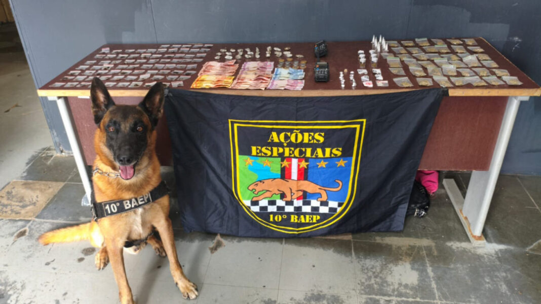 Na sequência da ação, o cão de faro da Polícia Militar, “Yran”, foi acionado e conseguiu localizar uma segunda sacola escondida na rota de fuga do suspeito, dobrando a quantidade de entorpecentes apreendidos.