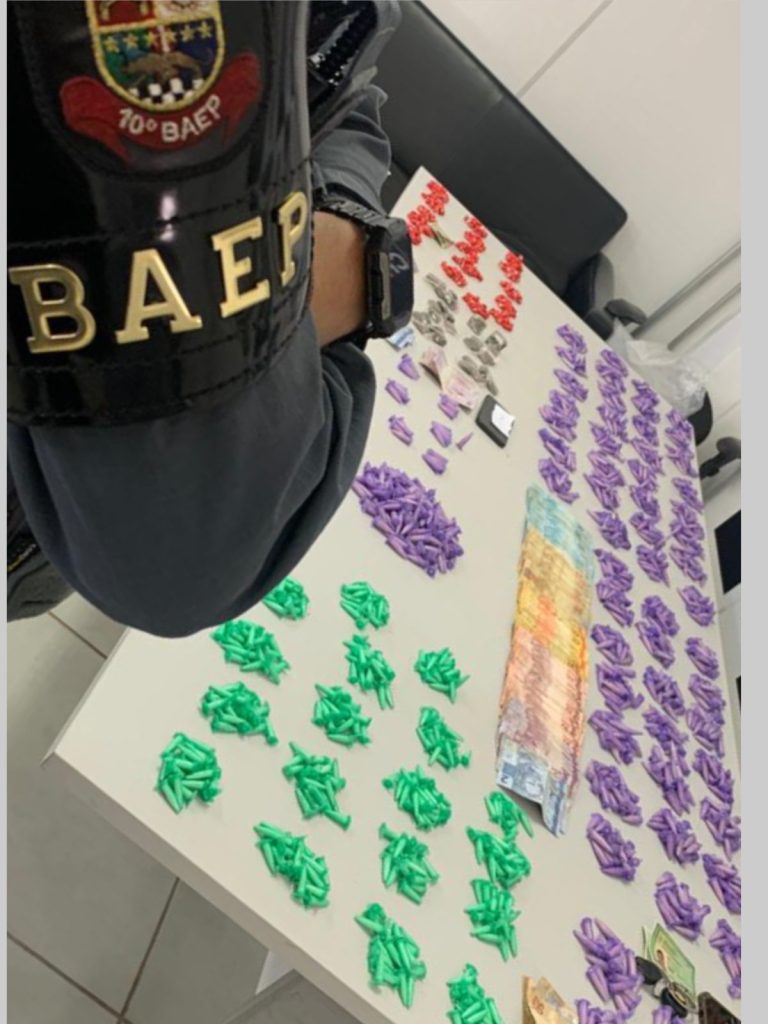 Além disso, o criminoso de 18 anos apontou um esconderijo dentro do Centro Comunitário Infantil da região. Os policiais localizaram uma mochila escondida na caixa d’água contendo 620 pinos roxos e 349 pinos verdes, cheios de cocaína.