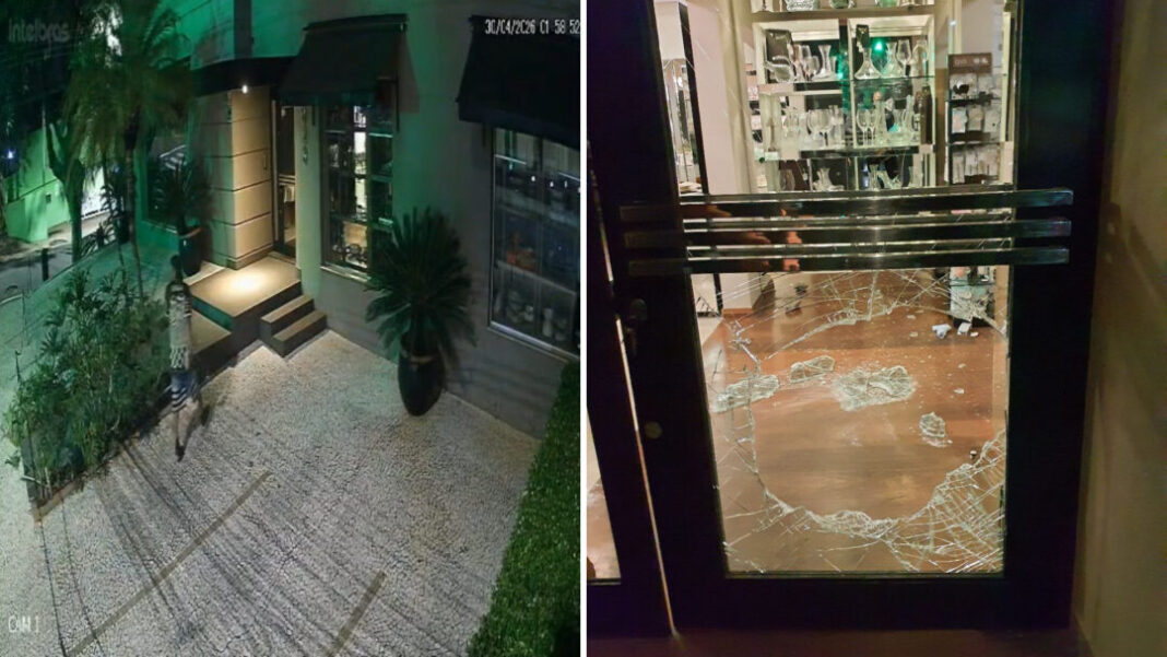Câmeras de monitoramento registraram toda a ação. O homem passa pela corrente de estacionamento às 1h58 com uma pedra na mão. Em seguida, arremessa o objeto contra a porta de vidro e termina de abrir a porta com o pé.