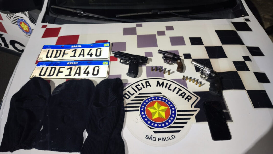 No local, os policiais apreenderam o Chevrolet Tracker roubado, dois revólveres, um calibre 32 e outro calibre 38, ambos com numeração suprimida, além de uma réplica de pistola. Também foram localizadas duas placas de veículos roubados, três máscaras do tipo balaclava e um telefone celular.