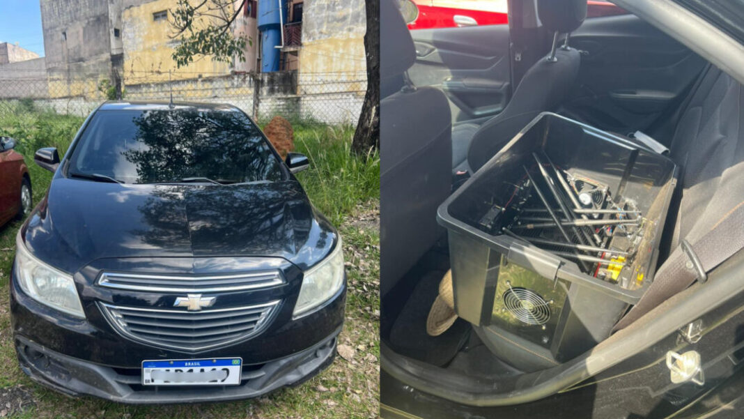 Durante vistoria no veículo, os policiais localizaram, no assoalho do banco traseiro, uma pistola Taurus calibre 380 com cinco munições intactas. Sobre o banco traseiro, dentro de uma caixa, foi encontrado o jammer.