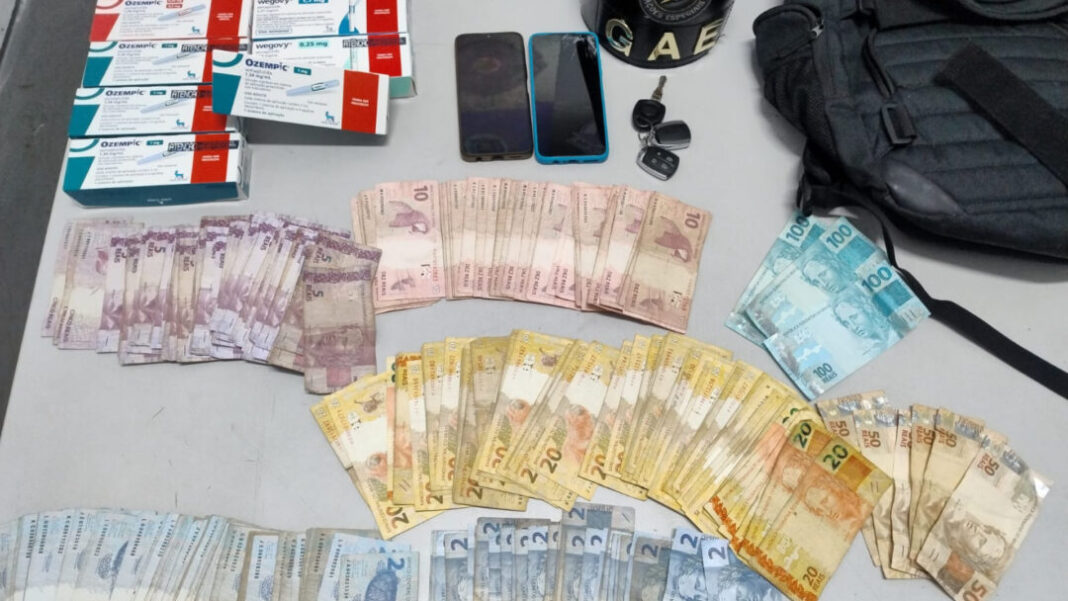 Entre os itens recuperados estão nove unidades dos medicamentos Ozempic e Wegovy, avaliados em cerca de R$ 12 mil, além de R$ 2.821,00 em dinheiro retirados do cofre da farmácia.