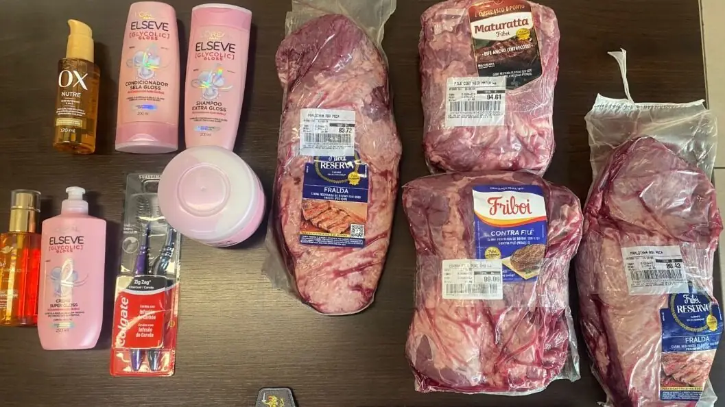 Durante a revista, os agentes encontraram na mochila cortes de carne e outros produtos, totalizando R$ 554,27 em mercadorias furtadas.