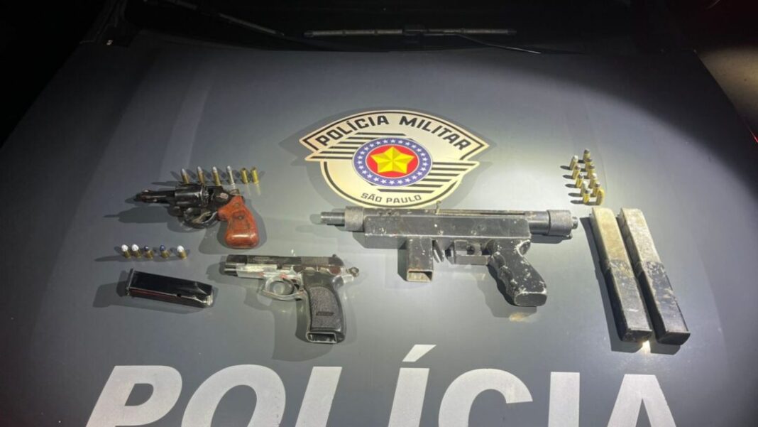 No confronto, os suspeitos foram alvejados. Com eles, foram apreendidas três armas de fogo: um revólver calibre .38, uma pistola calibre 9mm e uma metralhadora de fabricação artesanal calibre 9mm.