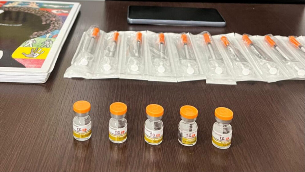 Durante a revista no imóvel, a própria indiciada apontou o local onde os produtos estavam armazenados: uma caixa de isopor guardada dentro de sua geladeira. No interior, os policiais localizaram cinco ampolas da substância irregular, que tenta imitar o famoso medicamento emagrecedor “Mounjaro”.