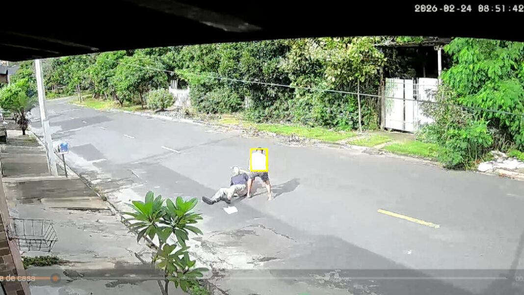Em seguida, o assaltante sai correndo de volta para a direção pela qual vinha seguindo o idoso. A vítima permanece caída ao chão, ferida. Toda a ação dura menos de 20 segundos.
