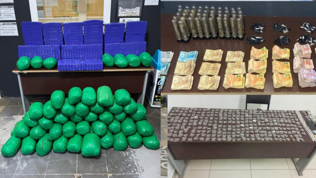 Na sexta-feira (26), na Rua São Cirilo, Jardim Santa Terezinha (Matão), Sumaré (SP), PM abordou suspeito nervoso que arremessou pacote. Apreenderam R$ 100, 320 porções de maconha, 58 de cocaína. Ele alegou consumo próprio e foi preso por tráfico.