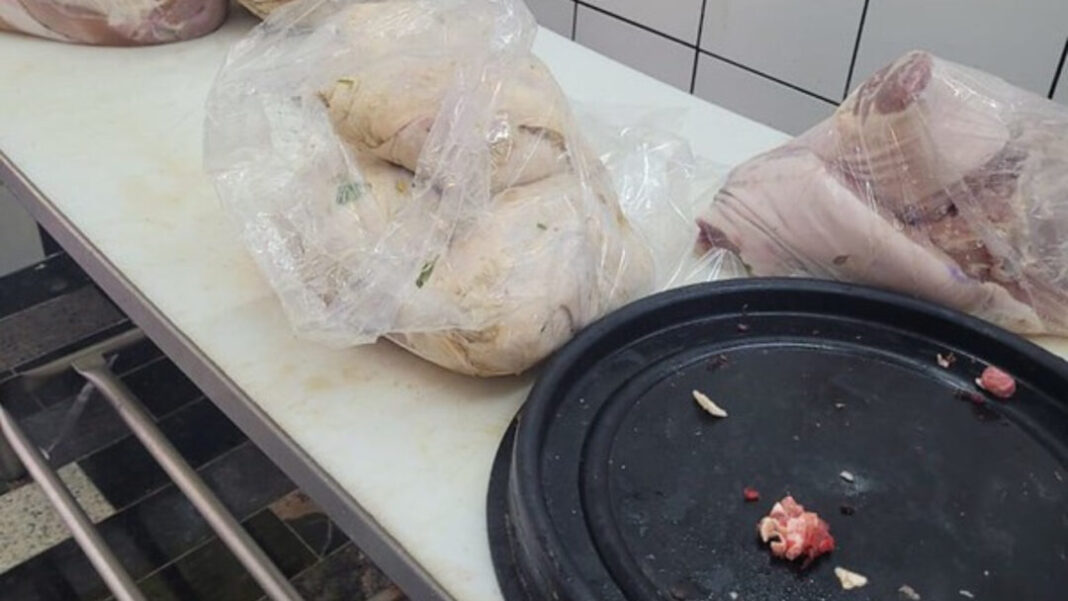 Durante a inspeção, a equipe verificou que o preparo das carnes era feito em um ambiente sem as condições mínimas exigidas pela legislação. A porta que dava acesso à área externa permanecia aberta e sem tela de proteção, facilitando a entrada de insetos e aumentando o risco de contaminação.